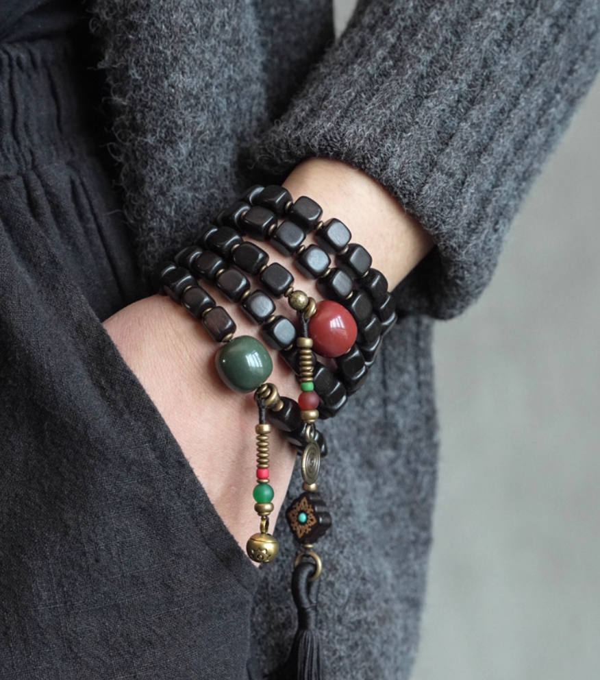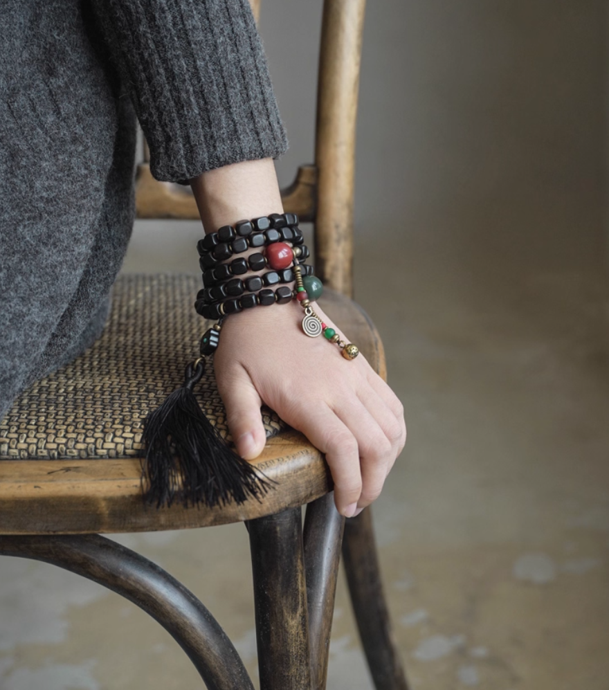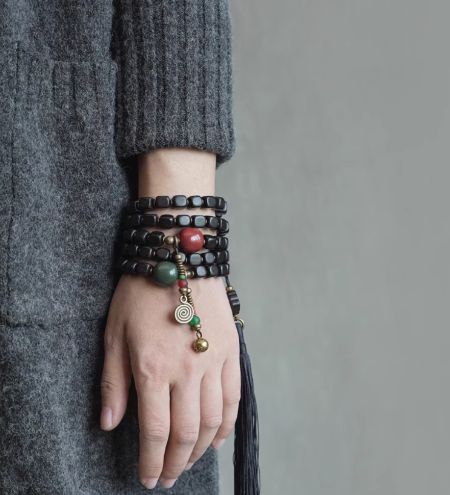 This bracelet merges nature’s enigmatic energy with artisanal creativity. Thunderstruck wood beads form the base, layered with colorful agate, brass accents, and a flowing silk tassel. The multi – circle design works as a stacked bracelet or a meditation/play piece—perfect for adding ethnic – mysterious flair to any outfit.