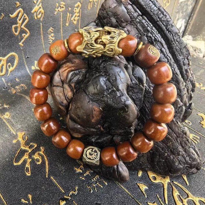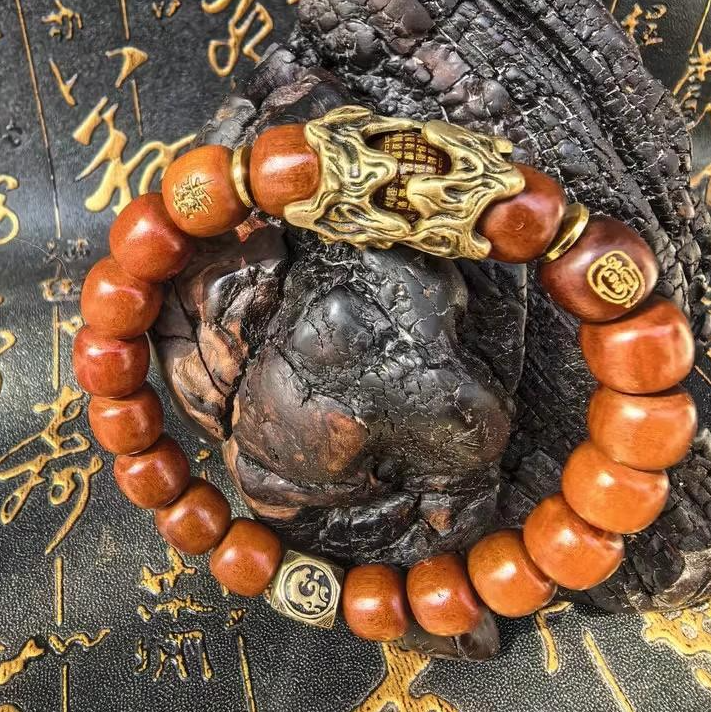 The thunderstruck wood beads, polished to a warm glow, carry the resonance of that fateful lightning strike—believed in lore to banish malevolence and anchor the wearer in courage, just as the trees stood firm against the storm’s fury. Accompanying them are beads inscribed with ancient characters, echoes of scripts used by sages to channel blessings of prosperity and protection.